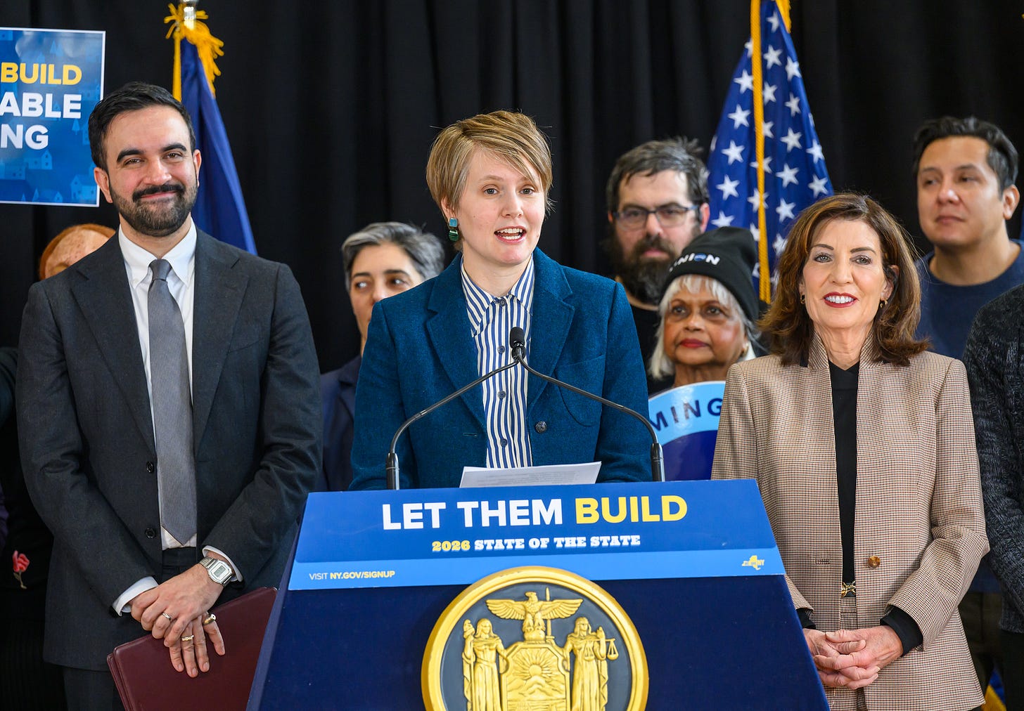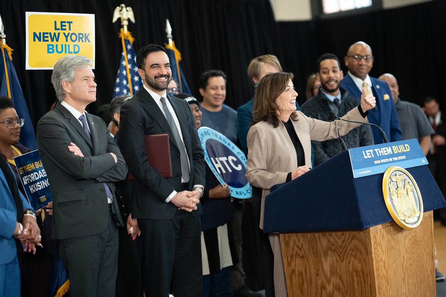Hochul, playing the elder stateswoman, offered a historical perspective peppered with gritty personal anecdotes about growing up near a toxic Lake Erie. We needed environmental review processes in the 1970s, she argued, but “somewhere along the way we got buried in bureaucracy. The status quo has failed miserably.” Mamdani picked up the baton here, repeatedly chanting “who’s ready to build the future?” and painting a vision of a city and state where working families can “afford to dream.”
